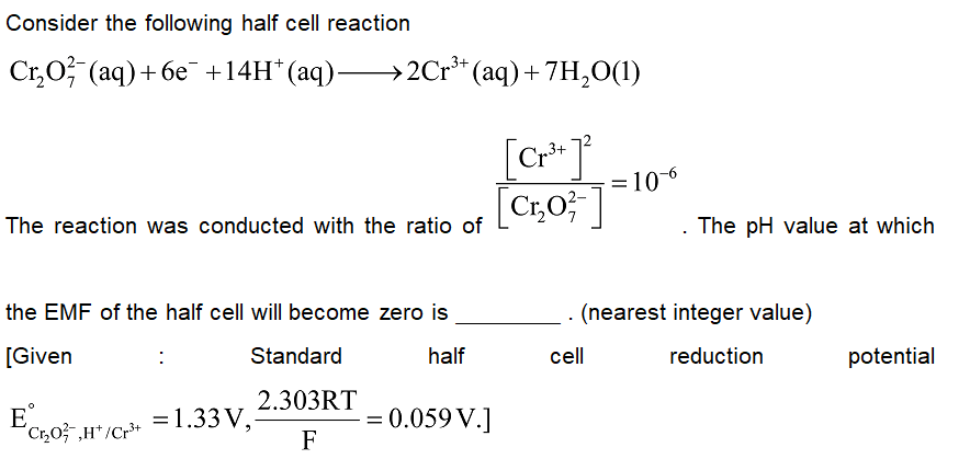 $\begin{aligned} & \mathrm{Cr}_2 \mathrm{O}_{7(\mathrm{aq})}^{-2}+14 \mathrm{H}_{(\mathrm{aq})}^{+}+6 \mathrm{e}^{-} \rightarrow 2 \mathrm{Cr}_{(\mathrm{aq})}^{+3}+7 \mathrm{H}_2 \mathrm{O}_{(1)} \\ & \mathrm{E}_{\mathrm{R}}=\mathrm{E}_{\mathrm{R}}^0-\frac{0.059}{6} \log \frac{\left[\mathrm{Cr}^{+3}\right]^2}{\left[\mathrm{Cr}_2 \mathrm{O}_7^{-2}\right]\left[\mathrm{H}^{+}\right]^{14}} \\ & 0=1.33-\frac{0.059}{6} \log \frac{10^{-6}}{\left[\mathrm{H}^{+}\right]^{14}} \\ & \frac{1.33 \times 6}{0.059}=\log \frac{10^{-6}}{[\mathrm{H}]^{14}} \\ & 135.254=-6-14 \log \left[\mathrm{H}^{+}\right] \\ & 141.254=14 \mathrm{pH} \\ & \mathrm{pH}=\frac{141.254}{14}=10.08\end{aligned}$
