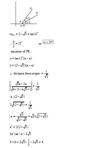 A line passing through the point $P(a, 0)$ makes an acute angle $\alpha$ with the positive $x$-axis. Let this line be rotated about the point $P$ through an angle $\frac{\alpha}{2}$ in the clock-wise direction. If in the new position, the slope of the line is $2-\sqrt{3}$ and its distance from the origin is $\frac{1}{\sqrt{2}}$, then the value of $3 a^2 \tan ^2 \alpha-2 \sqrt{3}$ is