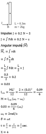 A uniform rod AB of mass 2 kg and Length 30 cm at rest on a smooth horizontal surface. An impulse of force 0.2Ns is applied to end B. The time taken by the rod to turn through at right angles will be $\frac{\pi}{x} S$, where x=