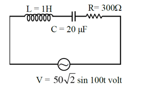 $$ \begin{aligned} & X_L=\omega L=100 \times 1=100 \Omega \\ & X_C=\frac{1}{\omega C}=\frac{1}{100 \times 20 \times 10^{-6}}=500 \Omega \\ & Z=\sqrt{\left(X_L-X_C\right)^2+R^2} \\ & \sqrt{(100-500)^2+300^2} \\ & Z=500 \Omega \\ & i_{\text {rms }}=\frac{V_{\text {rms }}}{Z}=\frac{50}{500}=0.1 \mathrm{~A} \end{aligned} $$ rms voltage across capacitor $$ \begin{aligned} & V_{\mathrm{rms}}=X_C i_{\mathrm{rms}} \\ & =500 \times 0.1=50 \mathrm{~V} \end{aligned} $$