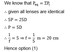 An effective power of a combination of 5 identical convex lenses which are kept in contact along the principal axis is 25D. Focal length of each of the convex lens is :