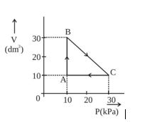 Work done is given by area enclosed in the PvsV cyclic graph or V vs P cyclic graph. Sign of work is positive for clockwise cyclic process for V vs P graph. $$ \begin{aligned} & \mathrm{W}=\frac{1}{2} \times(30-10) \times(30-10)=200 \mathrm{kPa}-\mathrm{dm}^3 \\ & =200 \times 1000 \mathrm{~Pa}-\mathrm{L}=2 \mathrm{~L}-\text { bar }=200 \mathrm{~J} \end{aligned} $$