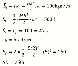 Consider a Disc of mass 5kg, radius 2m, rotating with angular velocity of 10rad/s about an axis perpendicular to the plane of rotation. An identical disc is kept gently over the rotating disc along the same axis. The energy dissipated so that both the discs continue to rotate together without slipping is J.