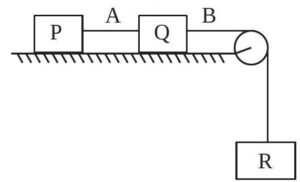 Each of three blocks P,Q and R shown in figure has a mass of 3kg. Each of the wire A and B has cross-sectional area $0.005 \mathrm{~cm}^2$ and Young's modulus $2 \times 10^{11} \mathrm{~N} \mathrm{~m}^{-2}$. Neglecting friction, the longitudinal strain on wire B is (Take $\mathrm{g}=10 \mathrm{~m} / \mathrm{s}^2$ )