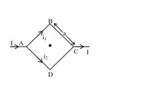 Figure shows a current carrying square loop $A B C D$ of edge length is ' a ' lying in a plane. If the resistance of the $A B C$ part is $r$ and that of ADC part is $2 r$, then the magnitude of the resultant magnetic field at centre of the square loop is