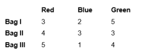 Given three identical bags each containing 10 balls, whose colours are as follows :