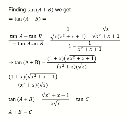 If $\tan \mathrm{A}=\frac{1}{\sqrt{x\left(x^2+x+1\right)}}, \tan B=\frac{\sqrt{x}}{\sqrt{x^2+x+1}}$ and $\tan C=\left(x^{-3}+x^{-2}+x^{-1}\right)^{\frac{1}{2}}, 0< $ A , B, C $<\frac{\pi}{2}$, then $\mathrm{A}+\mathrm{B}$ is equal to: