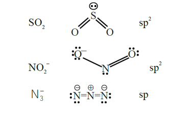 In $\mathrm{SO}_2, \mathrm{NO}_2^{-}$and $\mathrm{N}_3^{-}$the hybridizations at the central atom are respectively: