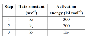 If the overall rate constant of the above transformation ( $k$ ) is given as $k=\frac{k_1 k_2}{k_3}$ and the overall activation energy $\left(E_a\right)$ is $400 \mathrm{~kJ} \mathrm{~mol}^{-1}$, then the value of $\mathrm{Ea}_3$ is $\$$ iqquad $\$ \mathrm{kJmol}^{-1}$ (nearest integer)