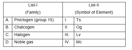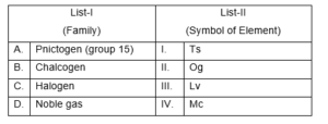 (A) Pnictogen ⇒ Mc (Moscovium), Atomic No. $=115$ (B) Chalcogen ⇒ Lv (Livermorium), Atomic No. $=116$ (C) Halogen ⇒ Ts (Tennessine), Atomic No. $=117$ (D) Noble gas $\Rightarrow \mathrm{Og}$ (Oganesson), Atomic No. $=118$