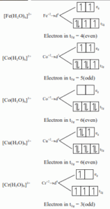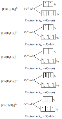 $\begin{aligned} & {\left[\mathrm{Fe}\left(\mathrm{H}_2 \mathrm{O}\right)_6\right]^{2+},\left[\mathrm{Co}\left(\mathrm{H}_2 \mathrm{O}\right)_6\right]^{2+},\left[\mathrm{Co}\left(\mathrm{H}_2 \mathrm{O}\right)_6\right]^{3+},} \\ & {\left[\mathrm{Cu}\left(\mathrm{H}_2 \mathrm{O}\right)_6\right]^{2+},\left[\mathrm{Cr}\left(\mathrm{H}_2 \mathrm{O}\right)_6\right]^{2+}}\end{aligned}$