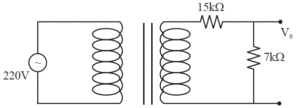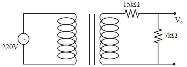 Primary coil of a transformer is connected to 220V ac. Primary and secondary turns of the transforms are 100 and 10 respectively. Secondary coil of transformer is connected to two series resistance shown in shown in figure. The output voltage $\left(V_0\right)$ is :