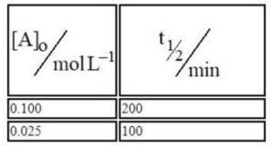 For a given reaction $R \to P,{t_{1/2}}$ is related to ${[A]_0}$ as given in table.