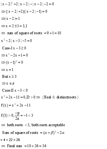 The sum of the squares of the roots of $|x-2|^2+|x-2|-2=0$ and the squares of the roots of $x^2-2|x-3|-5=0$, is