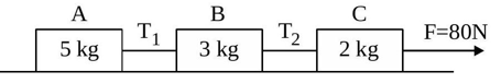 Three blocks A, B and C are pulled on a horizontal smooth surface by a force of 80" " N as shown in figure