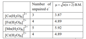 Least paramagnetic behaviour $=\left[\mathrm{Co}\left(\mathrm{H}_2 \mathrm{O}\right)_6\right]^2$